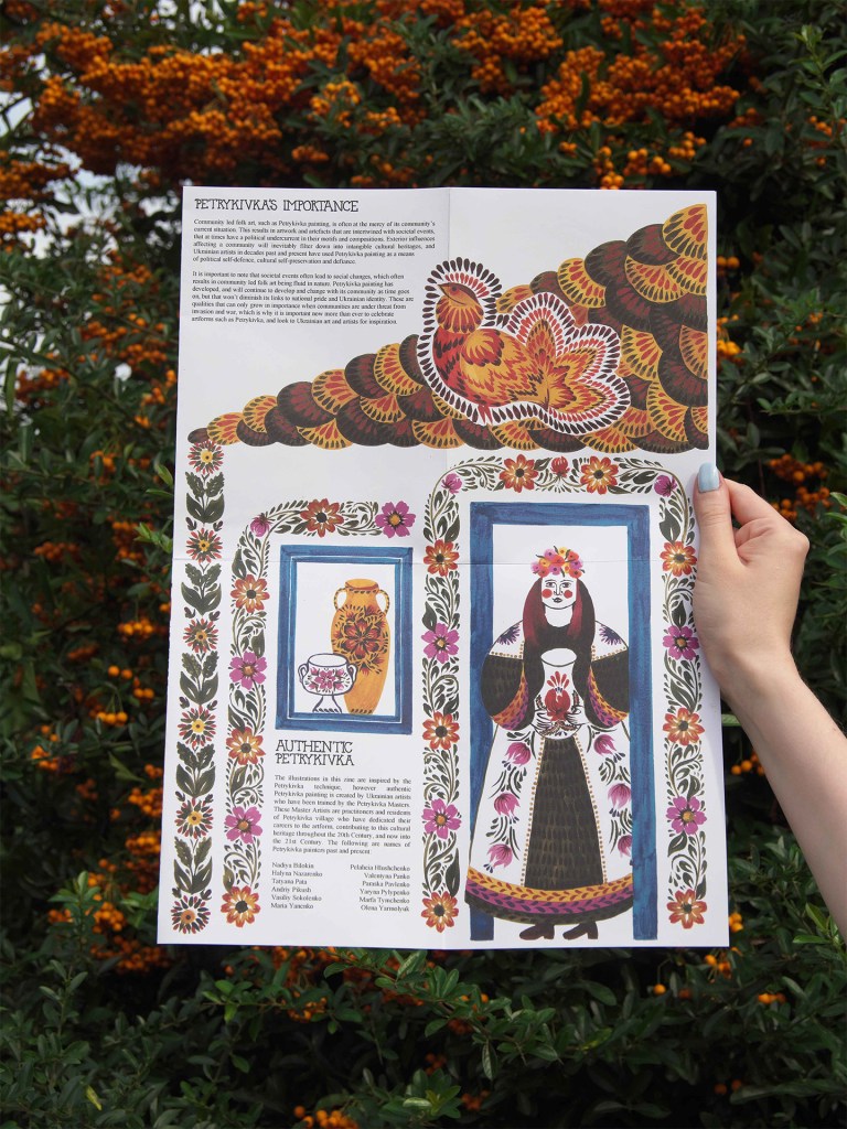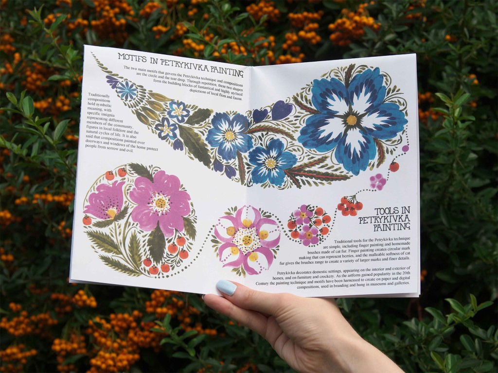 Showcasing the Ukrainian art tradition of Petrykivka, this zine was created as part of the Knowledge Exchange programme at Ravensbourne University London. The zine details the techniques and history of Petrykivka, which is one of Ukraine’s Intangible Cultural Heritages protected by UNESCO. All money earned from sales of the zine are donated to British Ukrainian Aid, providing humanitarian aid to those affected by the war in Ukraine.