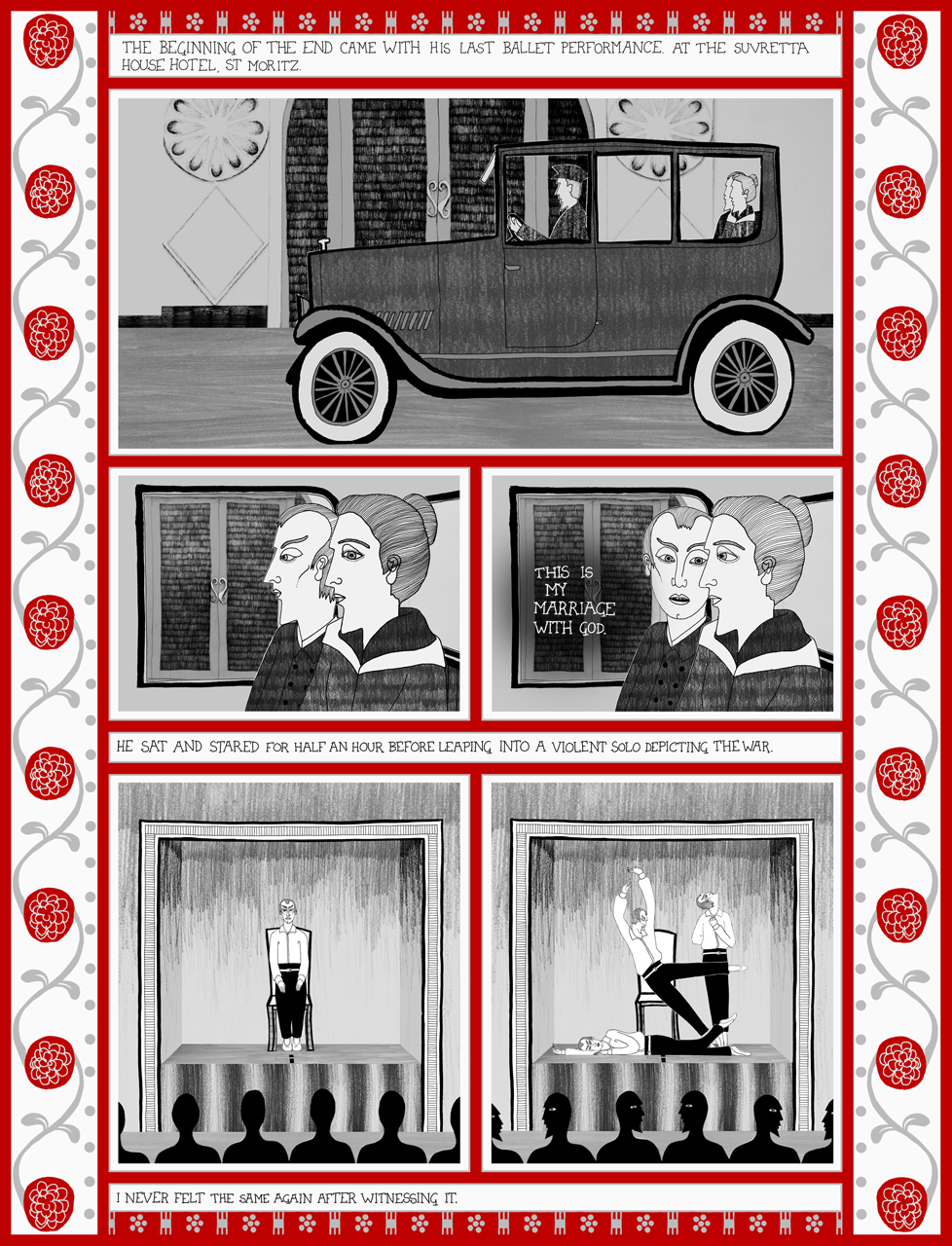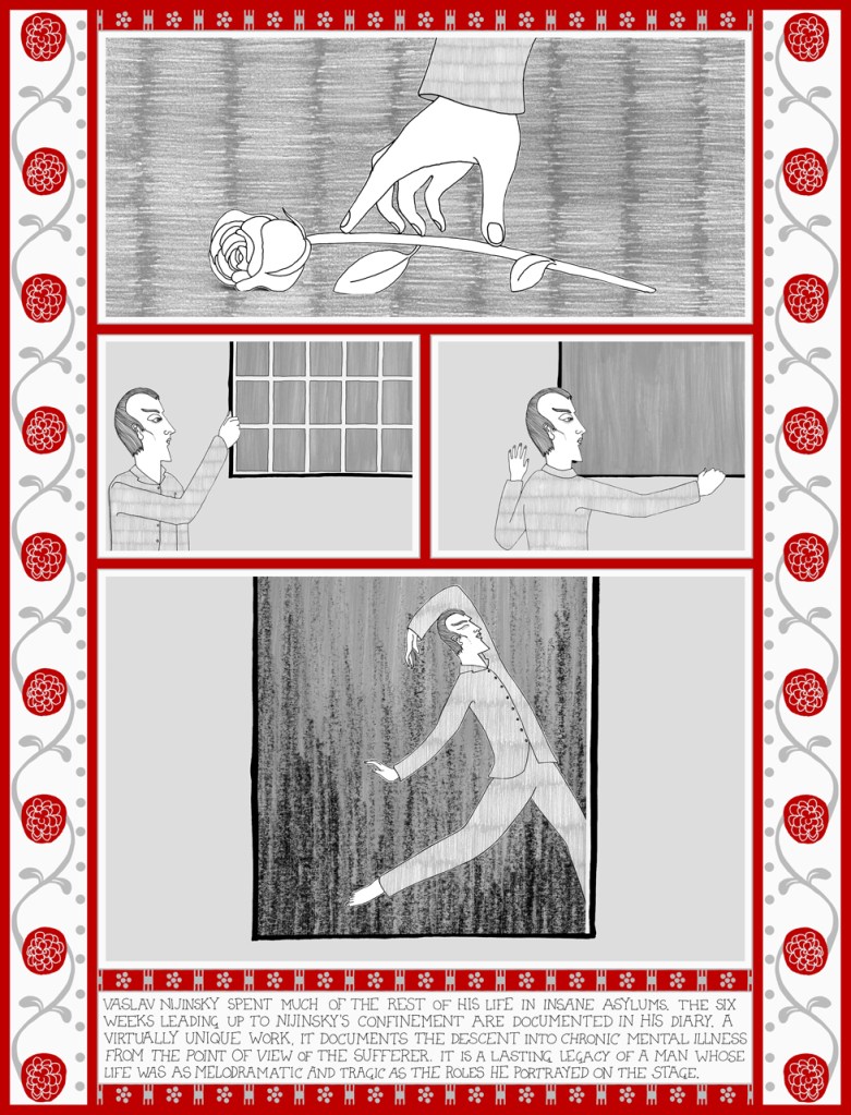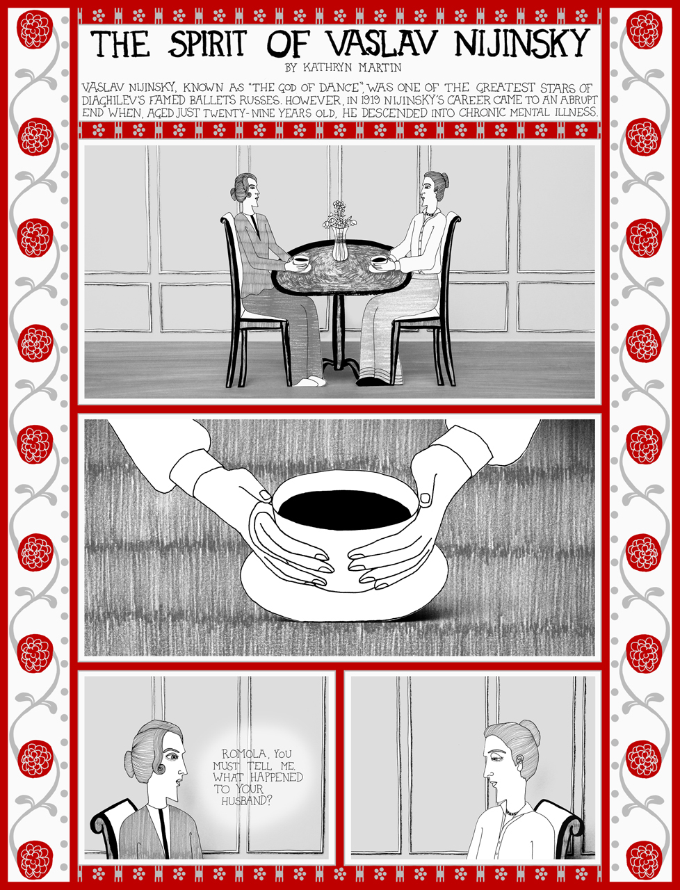 A short story based on a critical six weeks of ballet dancer, Vaslav Nijinsky’s life. After a glittering career, famed for roles such as the Golden Slave in Rimsky Korsakov’s Scheherazade, and the eponymous character in Stravinsky’s Petrouchka, Nijinsky, aged just twenty-nine years old, descended into chronic mental illness. In 1919, as his mental health deteriorated, Nijinsky wrote a diary. Kathryn’s graphic short story is based upon the themes and the events that surrounded the creation of the diary.