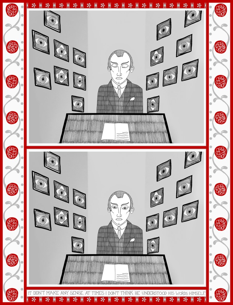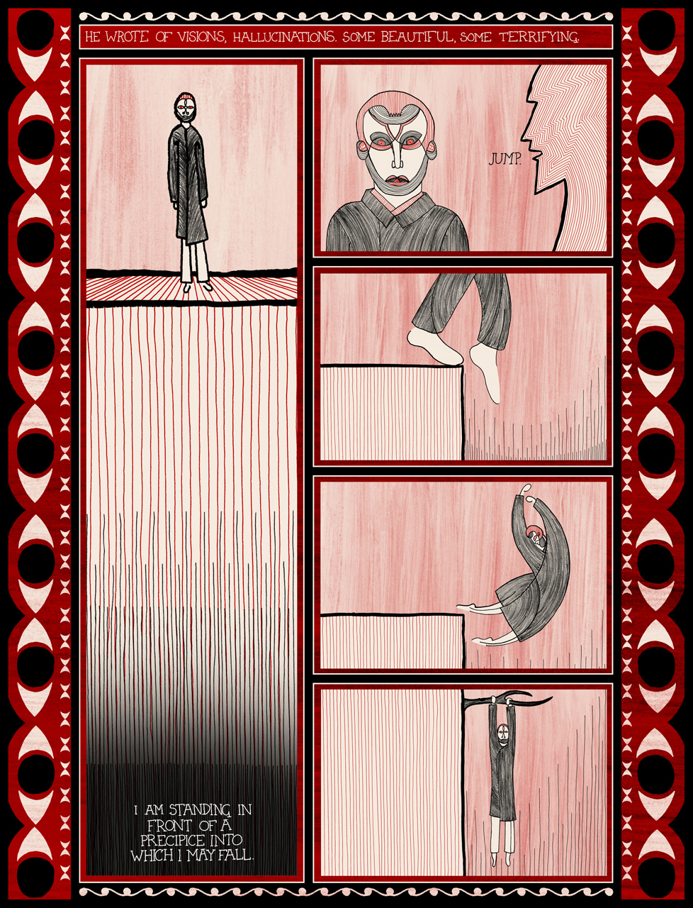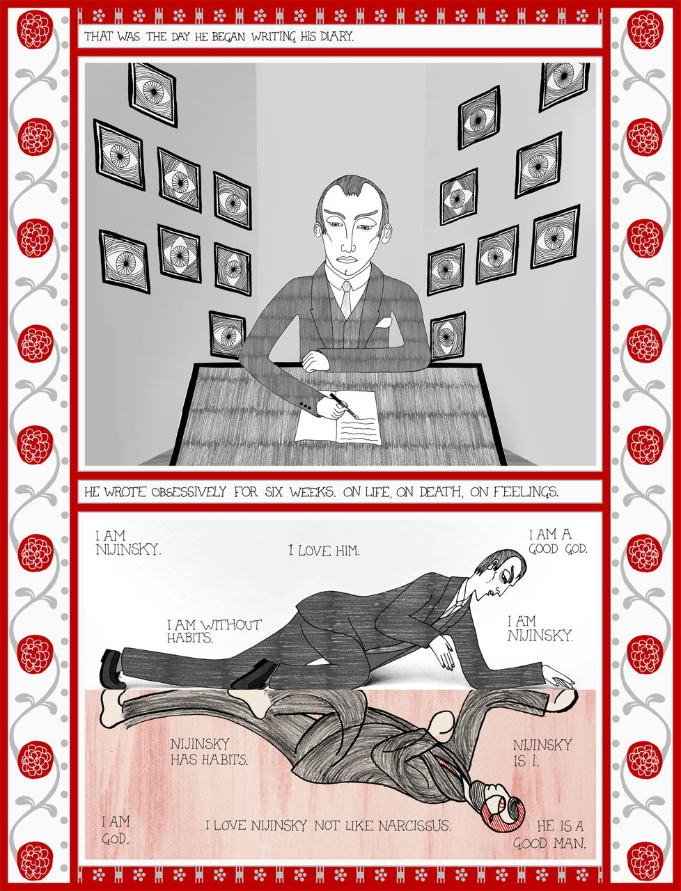 A short story based on a critical six weeks of ballet dancer, Vaslav Nijinsky’s life. After a glittering career, famed for roles such as the Golden Slave in Rimsky Korsakov’s Scheherazade, and the eponymous character in Stravinsky’s Petrouchka, Nijinsky, aged just twenty-nine years old, descended into chronic mental illness. In 1919, as his mental health deteriorated, Nijinsky wrote a diary. Kathryn’s graphic short story is based upon the themes and the events that surrounded the creation of the diary.