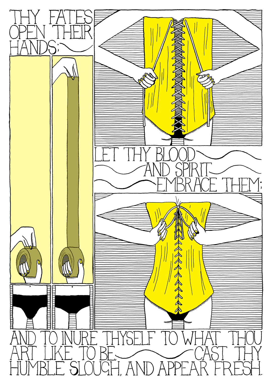 An adaptation of a scene from Shakespeare’s Twelfth Night. The comic depicts Malvolio as an Elizabethan puritan who throws his prejudices aside for his own potential gain, adorning his yellow stockings with cross garter (plus much more) to transform into a drag queen.